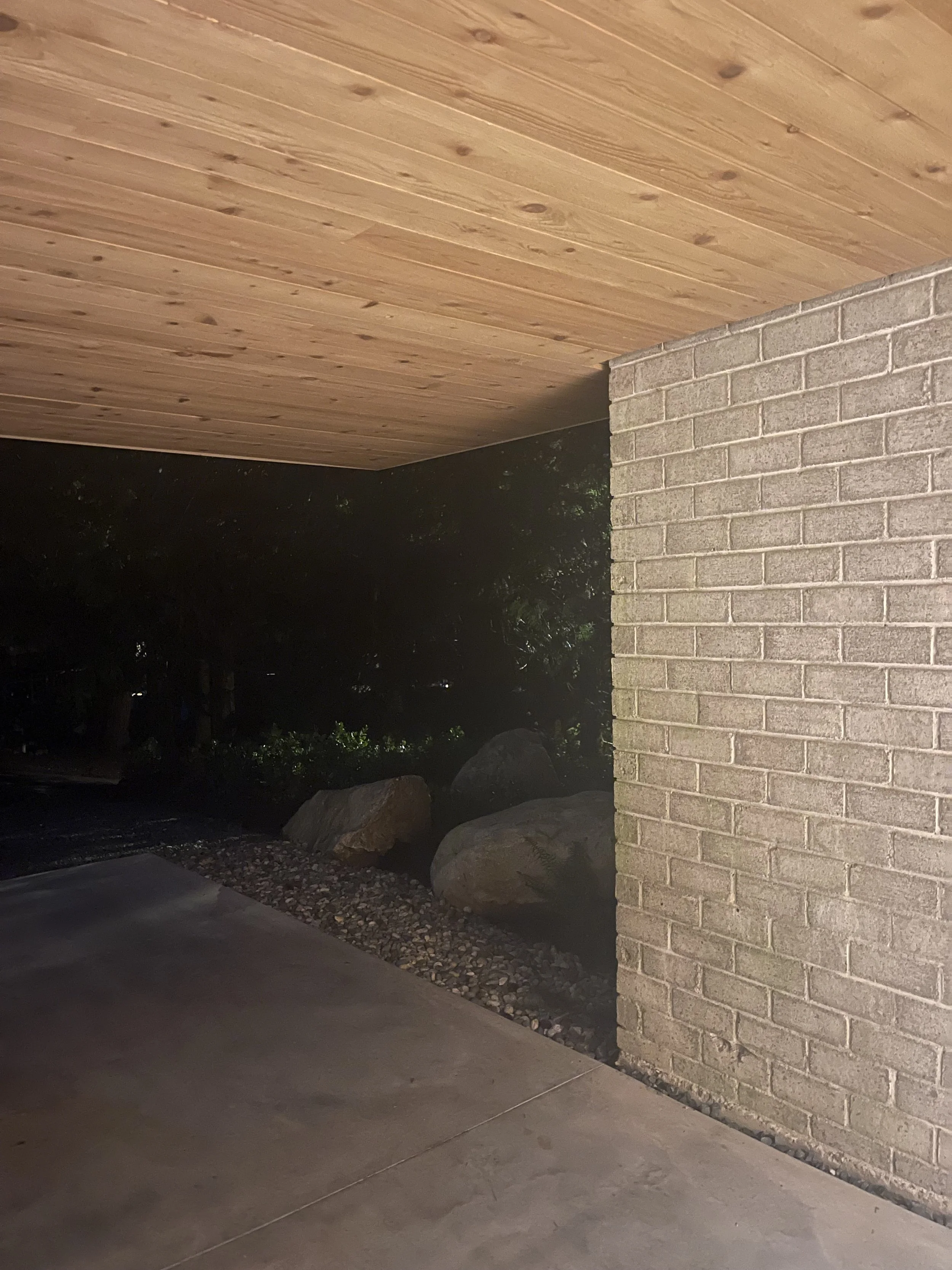 Original masonry elements, including the grey carport wall and sculptural wood-burning fireplace, were repaired and repointed. These vertical anchors continue to organize the composition, while extended glazing and restored cedar planes register shifting light throughout the day.
